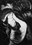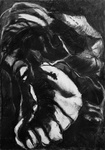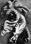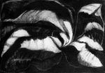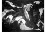 2006.In Suriname tekende ik reusachtige bladeren met zwart krijt en met de overal aanwezige bruinrode modder. De zon voegde er scherpe slagschaduw aan toe.. Op het atelier werkte ik verder met de schetsen in houtskool en conté. Na de serie grote tekeningen (6 stuks) –waarvan 3 briefkaarten - hangen er nu ook grote keramiek vormen aan de muur.